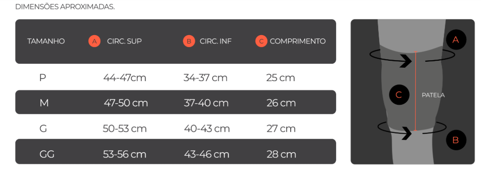 - Elastano de alta tecnologia possibilitando conforto e segurança nas articulações.